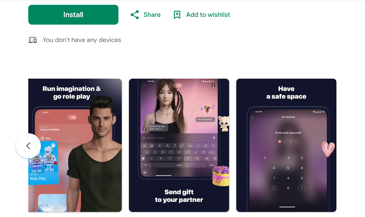 Check if the app works on your device. Replika is available on iOS, Android, and Oculus, while CandyAI and DreamBF are web-based.