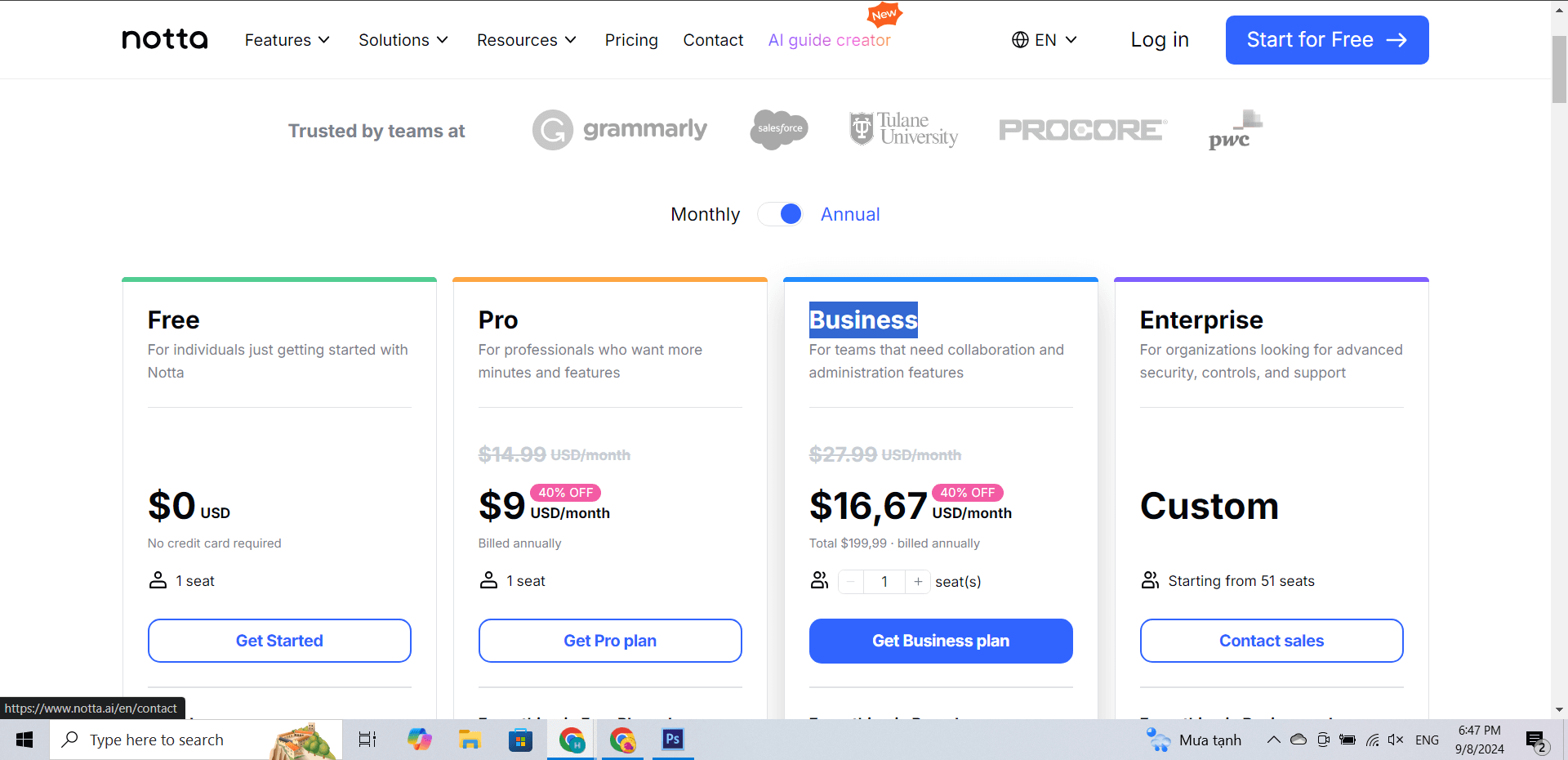 • Business Plan is $16,67 per month with unlimited transcription, advanced features.