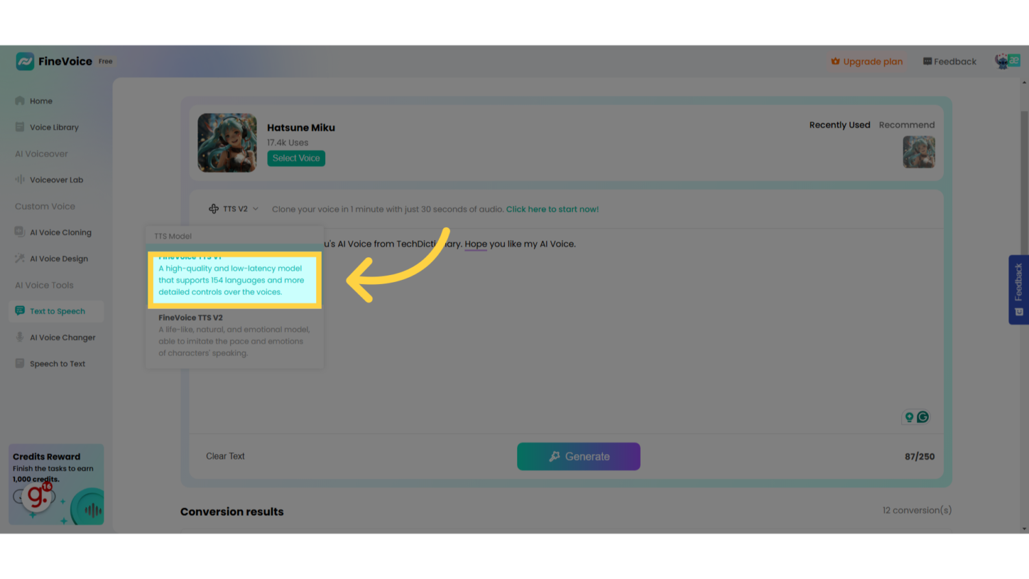 Step 2: Choose “Text to Speech” to generate your Hatsune Miku text-to-speech