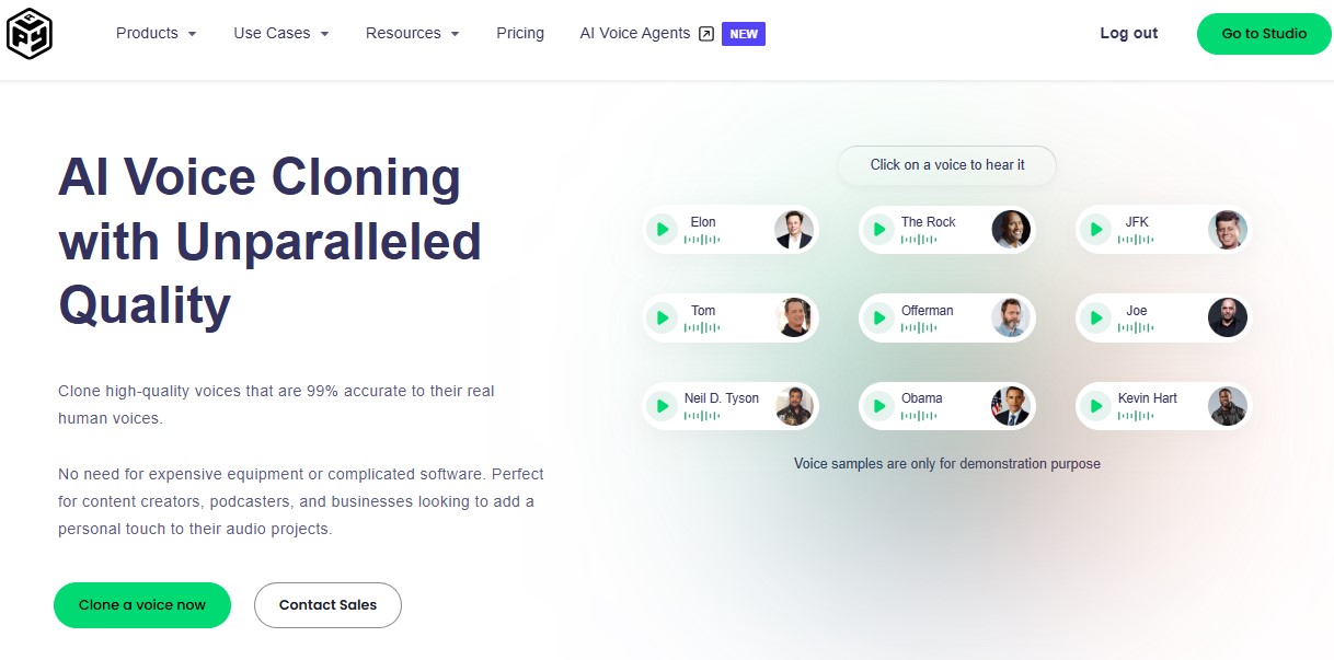 ✔ High-quality, personalized AI voices ✔ Intuitive and user-friendly interface ✔ Specially designed voiceover modes ✔ Continuously updated large resource library |