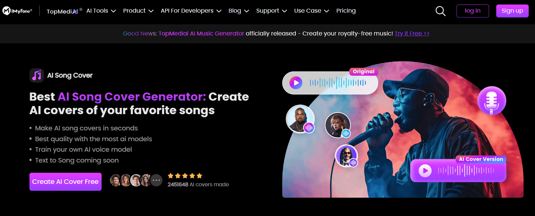 TopMediai is also a good option for creating Kim Kardashian AI voice. It will provide a set of tools to enhance your content creation workflow with realistic AI voices. It caters to a wide range of use cases, from voiceovers and music covers to voice modifications and beyond.