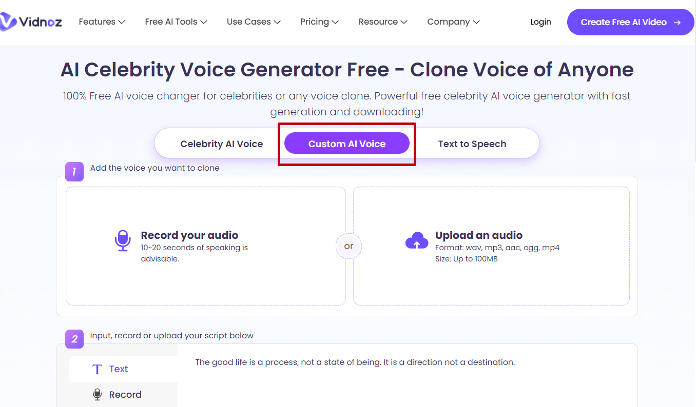 Step 1: Navigate Vidnoz AI Voice Changer feature, then select “Custom AI Voice”
