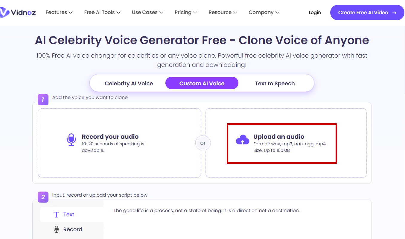 Step 2: Find a high-quality audio file of the Riggy voice (like an .mp3, .mp4, .aac, or .ogg,) that’s under 100MB. Then, upload it to Vidnoz for cloning.
