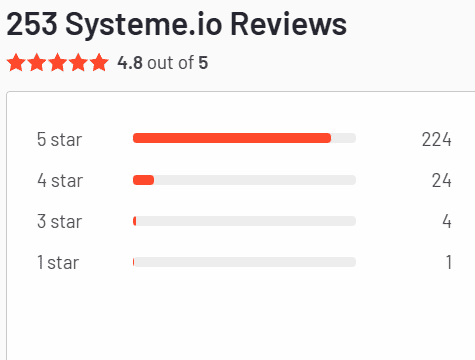 Shifting our focus to the G2 platform, a substantial majority of reviewers, precisely 224 out of 253, have given Systeme.io the highest rating possible — a resounding 5 stars. Furthermore, an additional 24 reviewers have expressed their satisfaction with a commendable 4-star rating. The collective sentiment from users on this platform resonates with an overwhelming appreciation for Systeme.io’s comprehensive capabilities.