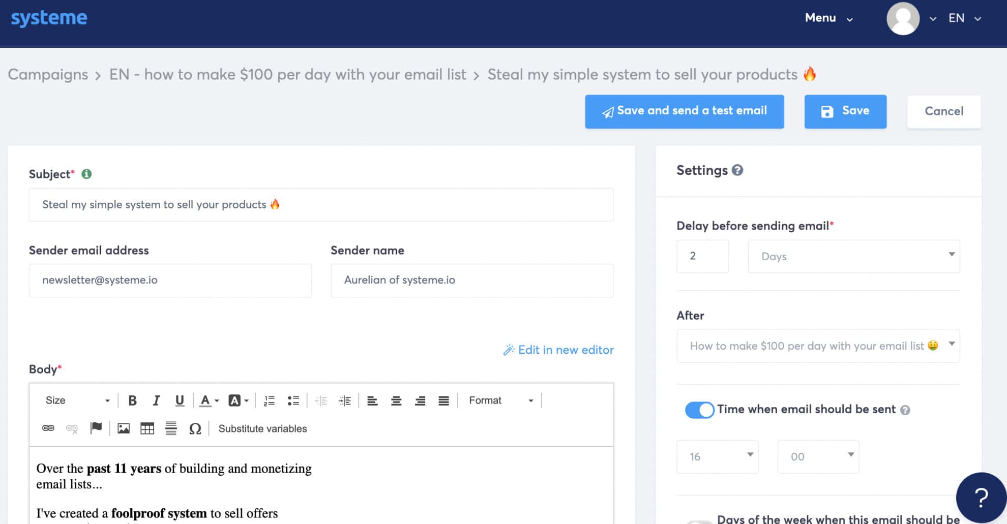 Moreover, Systeme.io empowers users to take control of their scheduling preferences. Once the email is crafted, users have the option to schedule it for future delivery, alleviating the need for immediate dispatch. This feature is particularly beneficial for businesses aiming to strategically time their communications, ensuring maximum visibility and engagement.