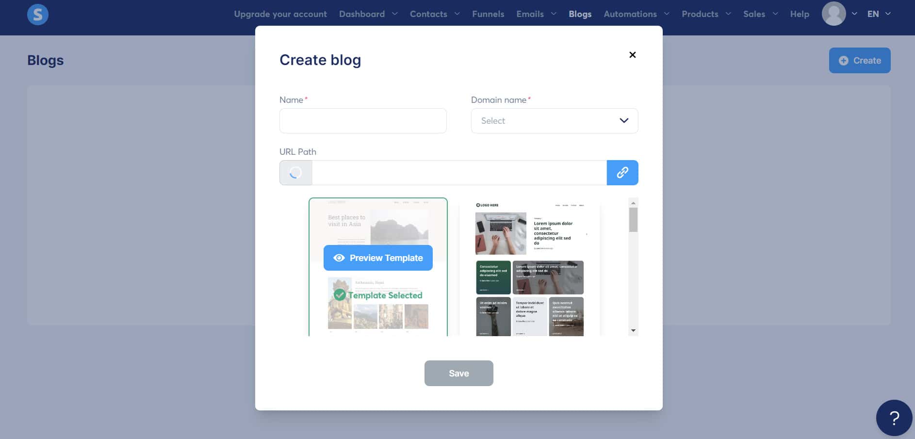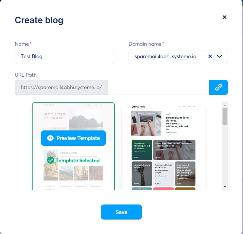 Systeme.io is an excellent tool for blogging, making it easy to create and manage a successful blog without the need for coding. Just click on the “Blog” option in the top header, provide a title, choose your domain address, select a template from their extensive database, and click “Save.” It’s a quick process, taking less than 5 minutes. After that, you can effortlessly add pages and customize the template to suit your preferences.