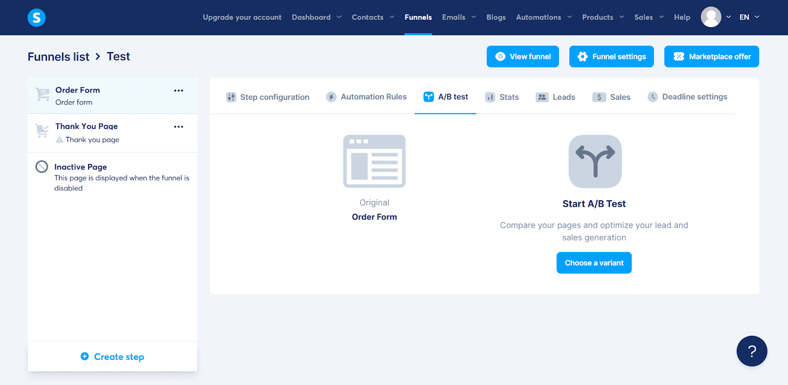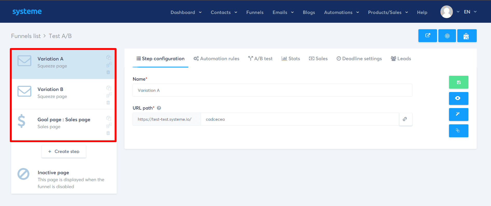 Upon reaching the A/B test phase, you’re presented with the task of selecting a variant for the original page. This strategic decision sets the stage for comparative analysis, allowing you to assess the performance and user engagement of different iterations. Subsequently, with a simple click on “Start A/B Testing,” Systeme.io sets the wheels in motion for a dynamic evaluation of your selected variants.