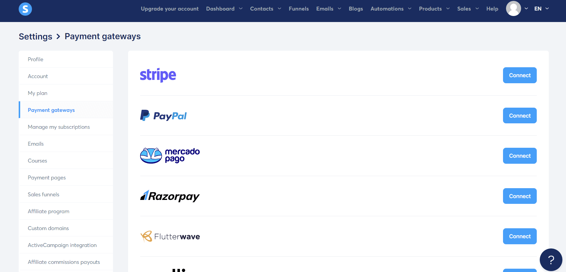 The integration of your Systeme.io account with a payment platform of your preference is a straightforward process. This integration extends to reputable payment gateways, offering you a diverse array of choices, including Razorpay, PayPal, Stripe, and Flutterwave. This flexibility ensures that you can align your payment processing with the specific needs and preferences of your business and target audience.