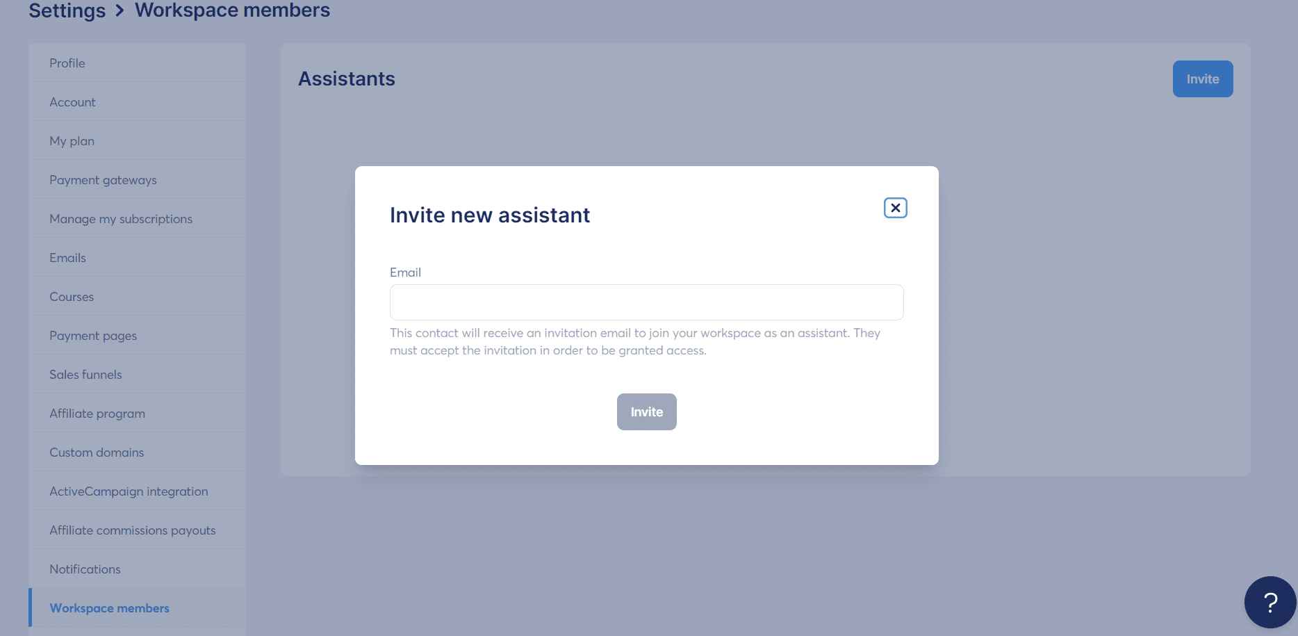 The process of inviting assistants is a breeze. A click on the “Invite” button initiates the process, where you simply input their email addresses. In a matter of minutes, they receive an email containing the invitation link to join the Systeme.io platform. If your assistants already have a Systeme.io account, the link seamlessly redirects them to the login page. For those without an existing account, the link guides them to the signup page, where they can swiftly register and integrate into the collaborative workspace.