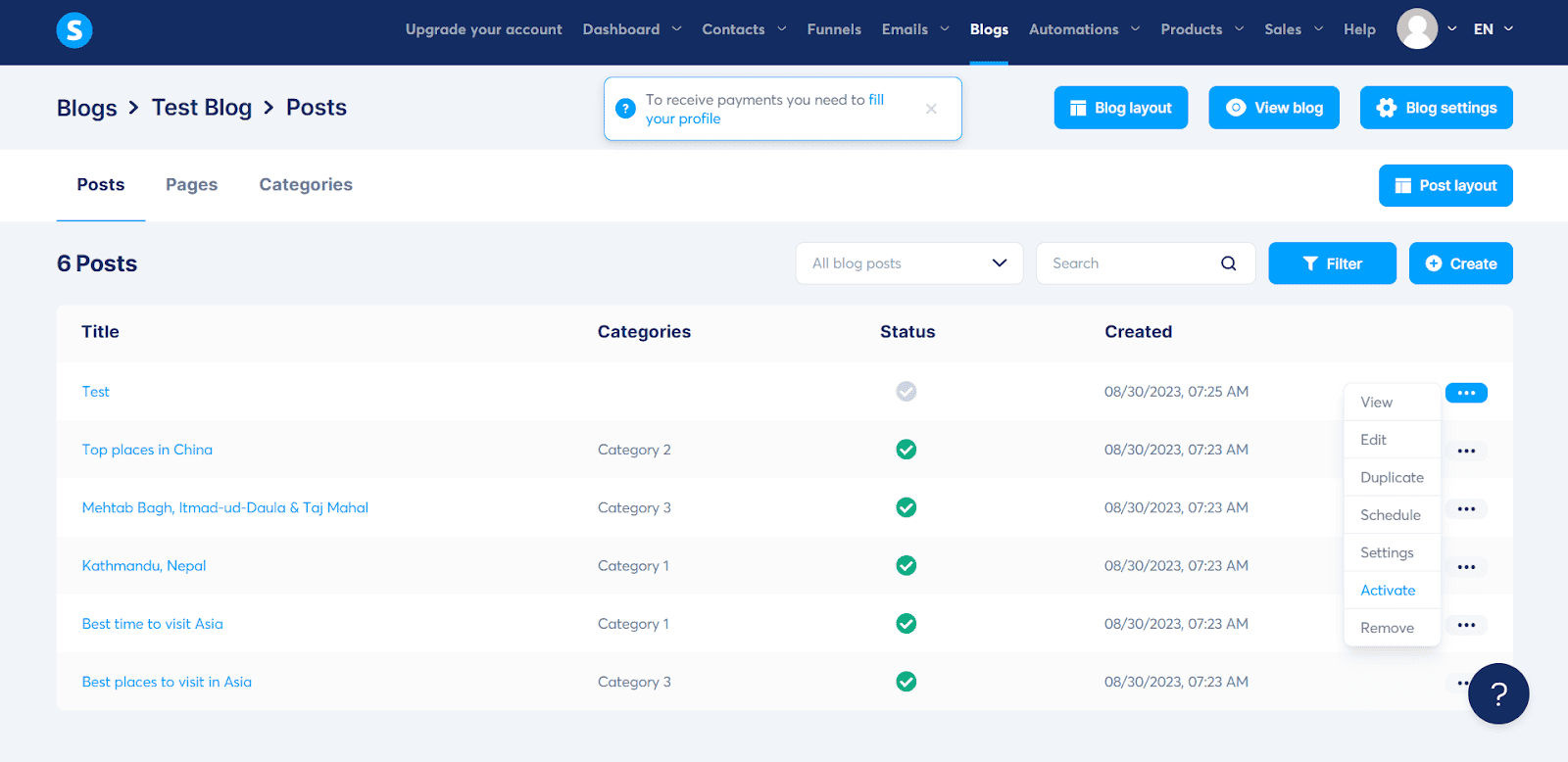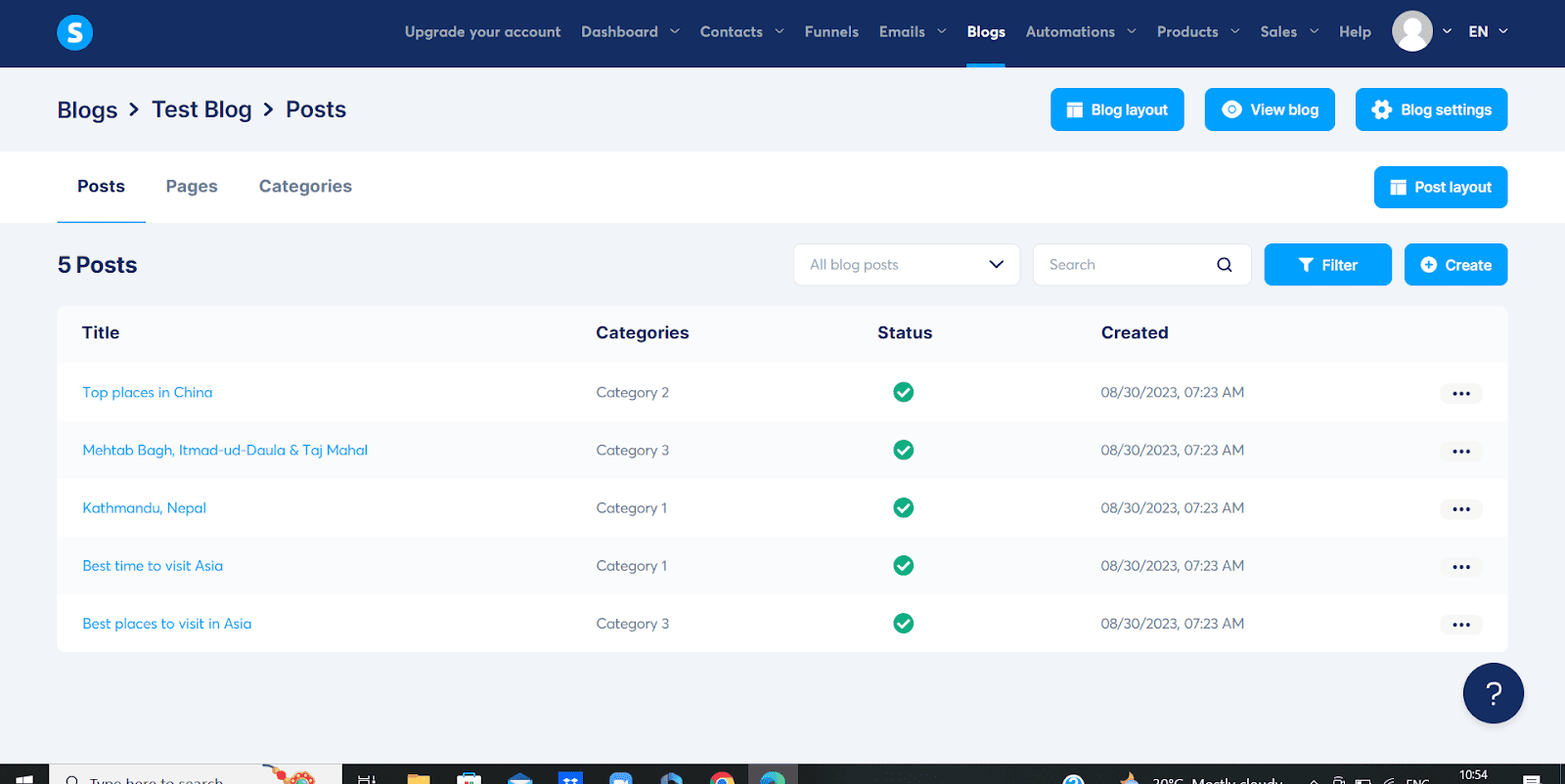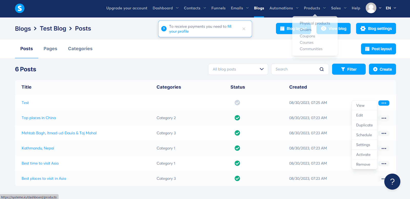 Upon the creation of the blog, Systeme.io extends its user-friendly interface to empower users with comprehensive control. From the Systeme.io dashboard, users can seamlessly manage various aspects of their blog, including page layout, posts, and other critical elements. This centralized control mechanism ensures that users can wield the full potential of their blogs without the need for external tools or complex processes.