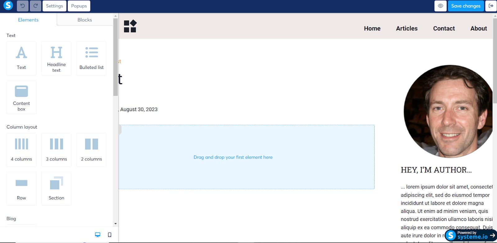 Within the Systeme.io interface, the left-side menu unveils a treasure trove of widgets under the “Blocks” tab. This utility gives users flexibility and ease in creating and structuring their Blog, including flexible features that help enhance the appeal and increase user interaction on the Blog. your. The drag-and-drop mechanism allows users to easily integrate their widgets and Blog pages and tweak their placement according to their preferences.