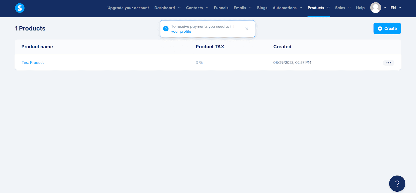 Now, similar to the blog page, locate the “Create” button in the top-right corner of the screen. Click on it to introduce a new product. In this guide, we’ve already generated a test product for your reference.