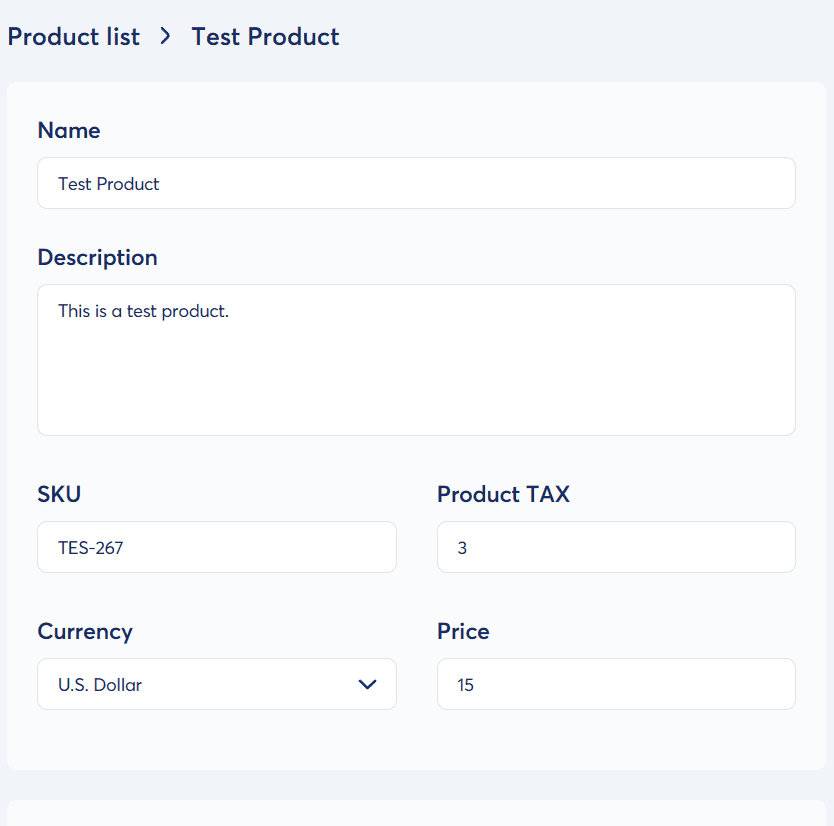 A fresh window will appear, allowing you to input product details such as the name, description, tax information, price, and preferred currency.