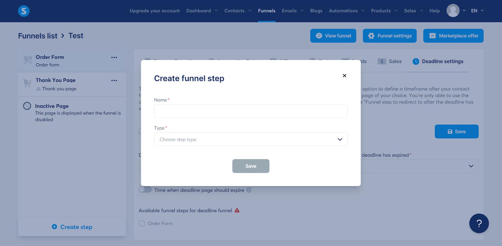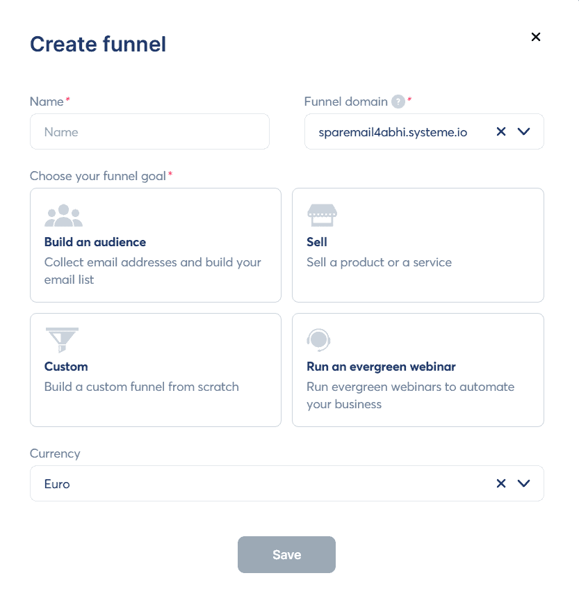 In the following window, input the funnel name and domain and specify your goal. In this instance, our objective is to promote the product created earlier. Select your preferred currency and click on “Save.”