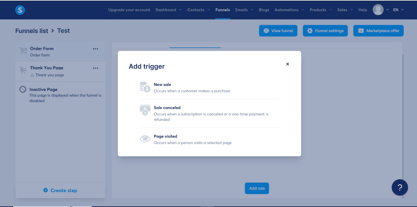 Three types of events can result in a trigger. You’ll see the options once you click the “Add Rule” button. You can trigger an event when a new sale occurs, a page is visited, or a sale is canceled.