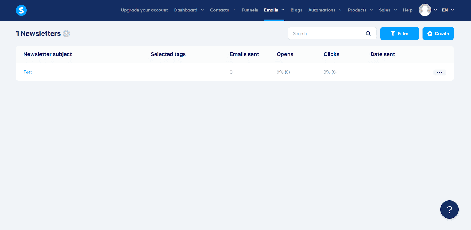 Next, determine the type of email service you wish to use. In this guide, we’ve opted for newsletters. As is consistent with the Systeme.io platform, locate the “Create” option on the subsequent page to initiate the process.