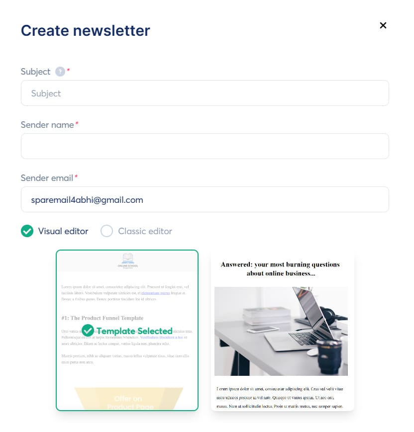 Upon clicking this option, a new window will appear prompting you to choose an email template and input the sender’s name and email ID. After saving, you’ll observe a newly added email form in the list.