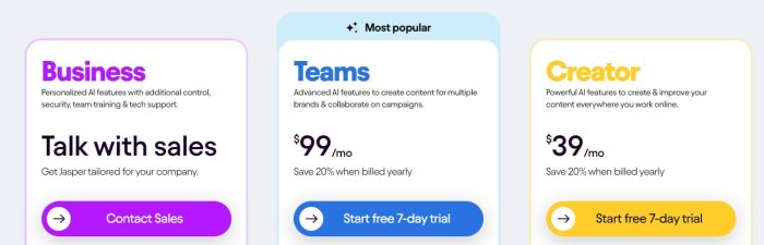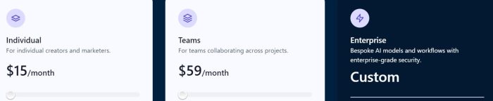 If you’re just starting and want something basic, the Creator plan is perfect. But if you’re after more robust tools to make content creation and campaigns more efficient, the Teams plan is what you’re looking for. For those with specific needs, the Business Plan is tailored to your requirements, forming a customized package.