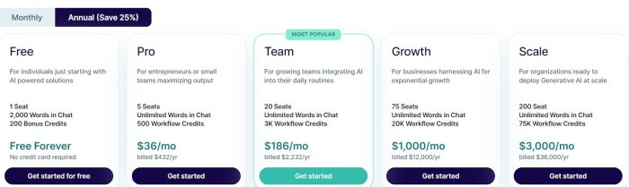 There are four plans available for users, each offering different word counts. The prices are affordable, and what makes it even better is that each plan comes with unlimited chat, projects, Infobase entries, and API access.