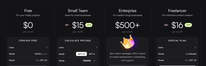 For enterprises with more extensive needs, the Enterprise package emerges as a comprehensive solution. It goes beyond the standard offerings, providing access to customized AI models, API capabilities for seamless integrations, and the invaluable support of a dedicated account manager. This package is curated to address the unique requirements of larger teams, ensuring a tailored and efficient content creation workflow.