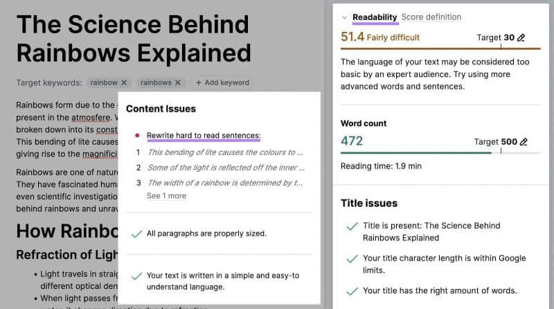 The Readability Checker isn’t just a grammar guardian; it goes beyond, serving as a discerning critic of your writing tone. It provides insightful feedback, flagging instances where your content might inadvertently lean towards sounding robotic. This feature isn’t just about identifying errors; it’s a guide nudging you toward the sweet spot of natural and relatable language.