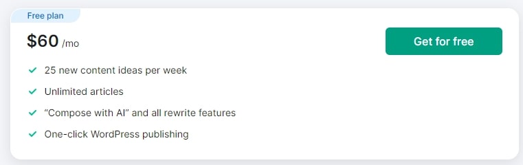 | WordPress Users | $60/month | Free-Forever Plan | 3 articles/month | – Sentence Simplification