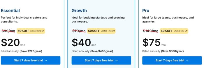 | Content Repurposing | $15/month | 7-Day Free Trial | Includes everything for a 10-credit trial run | – Readability Checker